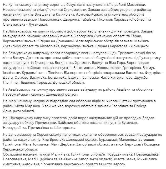 3. Идут тяжёлые бои за Бахмут, в его окрестностях россияне атакуют в районах Григоровки, Богдановки, Хромово и Белой Горы.