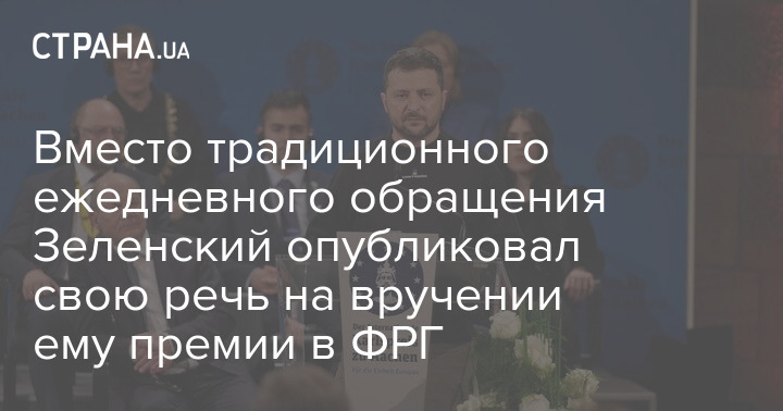 Вместо традиционного вечернего обращения Владимир Зеленский в конце дня опубликовал полное видео своей речи в Аахене (Германия), где ему торжественно вручили Международную дали премию имени Карла Великого.