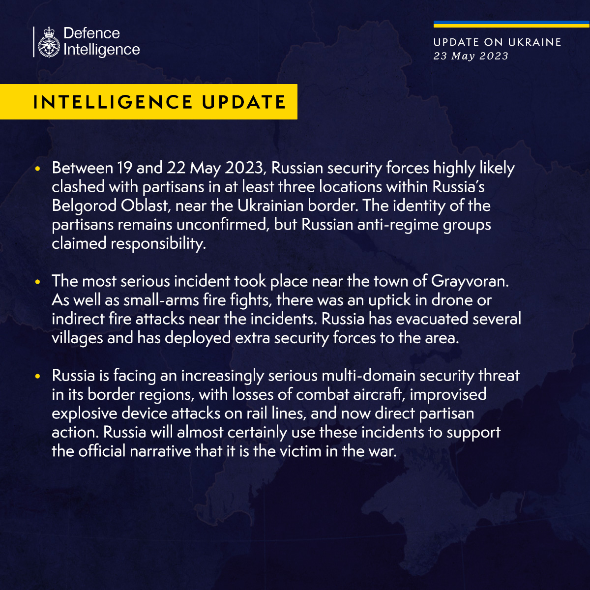 В Минобороны Британии считают, что "Россия сталкивается со все более серьезной многоплановой угрозой безопасности в своих приграничных районах, потерями боевых самолетов, атаками самодельных взрывных устройств на железнодорожных путях, а теперь и прямыми партизанскими действиями".