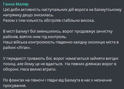 На флангах на севере и юге от Бахмута есть незначительное продвижение украинских военных, сообщила Маляр.