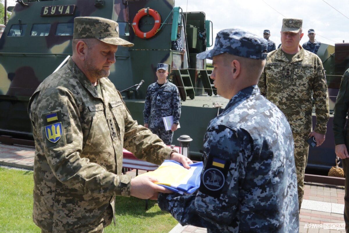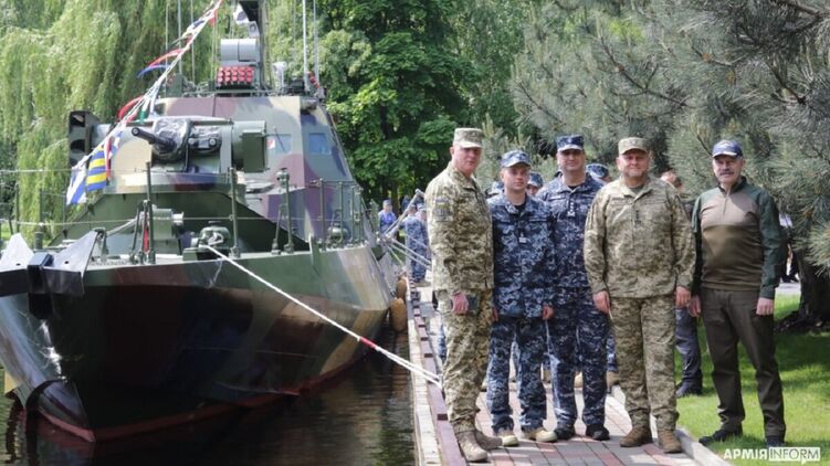 Фото с Залужным во время сегодняшней передачи Военно-морским силам артиллерийского катера "Буча" публикуют ресурсы Минобороны.