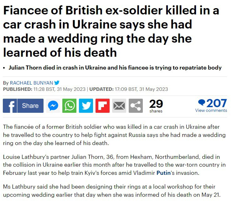В Украине в автокатастрофе погиб снайпер из Великобритании Джулиан Торн, который приехал сюда для подготовки военнослужащих ВСУ. Вскоре у него должна была состояться свадьба.