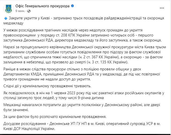 В ходе расследования гибели людей из-за недопуска граждан к укрытию в Киеве правоохранители задержали четырех человек – первого заместителя Деснянской РГА, директора медучреждения и его заместителя, а также охранника.