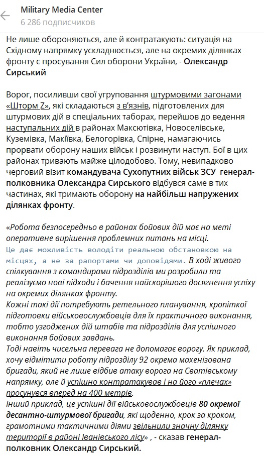 "Хочу отметить работу подразделения 92 отдельной механизированной бригады, которое не только отбило атаку врага на Сватовском направлении, но и успешно контратаковало и на его "плечах" продвинулось вперед на 400 метров", - заявил командующий.
