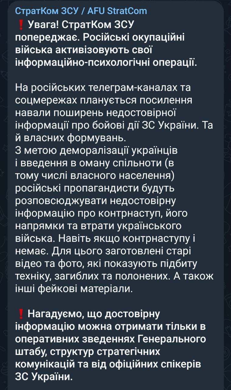 "Российские пропагандисты будут распространять недостоверную информацию о контрнаступлении, его направлениях и потерях украинской армии. Даже если контрнаступления и нет. Для этого заготовлены старые видео и фото, которые показывают подбитую технику, погибших и пленных. А также другие фейковые материалы", - заявили в Страткоме.