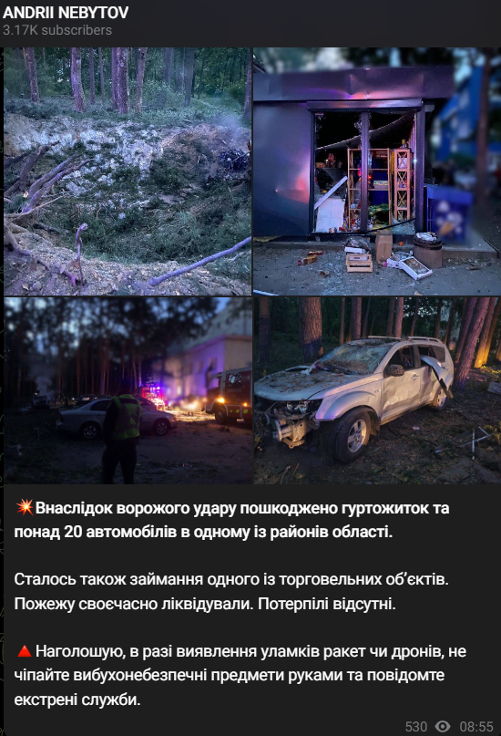 Также в Киевской области повреждено общежитие и более 20 автомобилей в одном из районов. Произошло возгорание одного из торговых объектов. Пожар своевременно был ликвидирован, потерпевшие отсутствуют, сообщил начальник полиции.