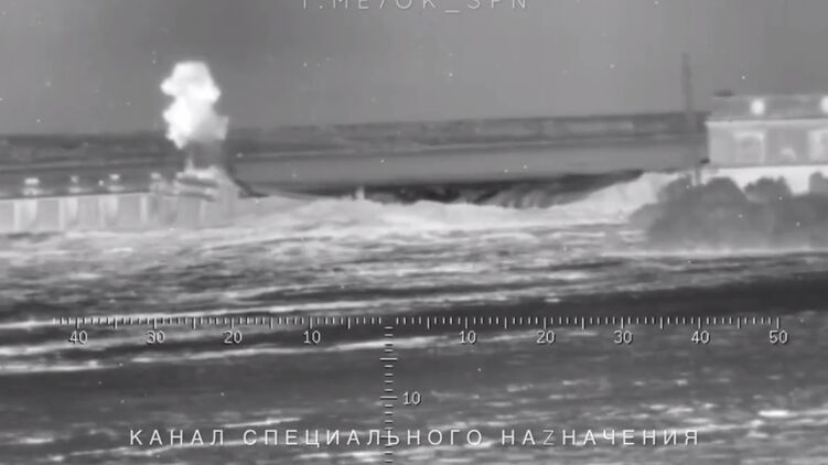 На кадрах надводные конструкции дамбы уже обрушены и сквозь них льется вода, когда происходит вспышка с левой от зрителя стороны. Она довольно слабая. После вспышки от места взрыва начинает валить дым, при этом не заметно, чтобы конструкция дамбы стала обваливаться или проседать.