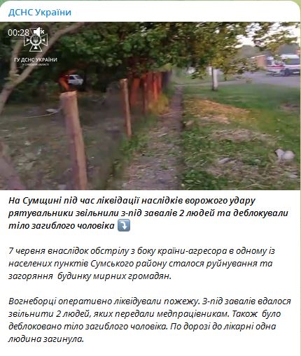 Спасатели сообщают, что 7 июня в одном из населенных пунктов Сумского района произошло разрушение и возгорание дома в результате обстрела со стороны РФ.