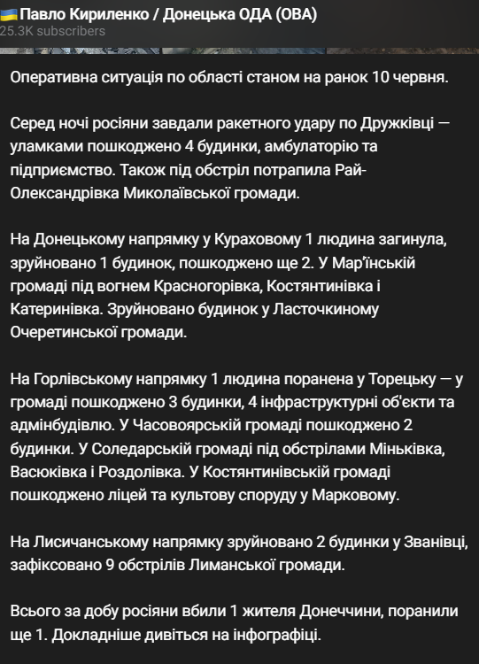 Ранее мы подводили итоги событий 9 июня. Ночью Россия атаковала дронами Одесскую область. ОК "Юг" сообщает, что все "Шахеды" удалось сбить, но в результате падения обломков есть погибшие и раненые. На правом берегу Херсонской области остаются подтопленными 35 населенных пунктов, но вода понемногу отступает.