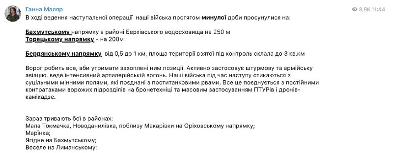 Ранее замминистра обороны Маляр сообщала, что на Бахмутском направлении ВСУ продвинулись в районе Берховского водохранилища на 250 метров.