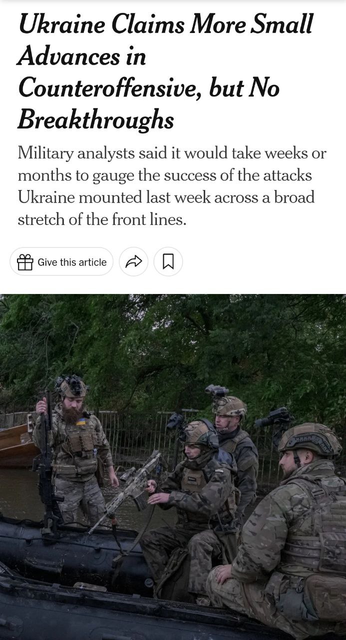 "Украинские завоевания касались крошечных деревень, и до сих пор не было никаких признаков серьезного прорыва в густой сети обороны российских оккупантов", - говорится в статье.