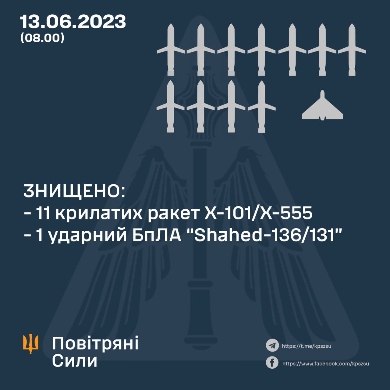 Всего было запущено 14 крылатых ракет Х-101/555, из которых 10 были уничтожены противовоздушной обороной. Также был нанесен удар 4 "Шахедами", 1 из них уничтожен.