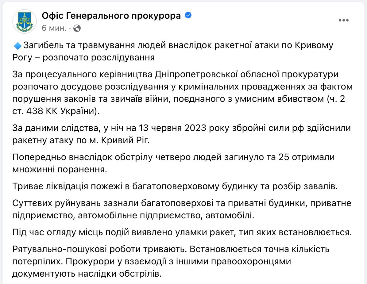 07.17 Глава Днепропетровской ОВА Сергей Лысак сообщает, что в результате ракетной атаки в Кривом Роге есть убитые и раненые.