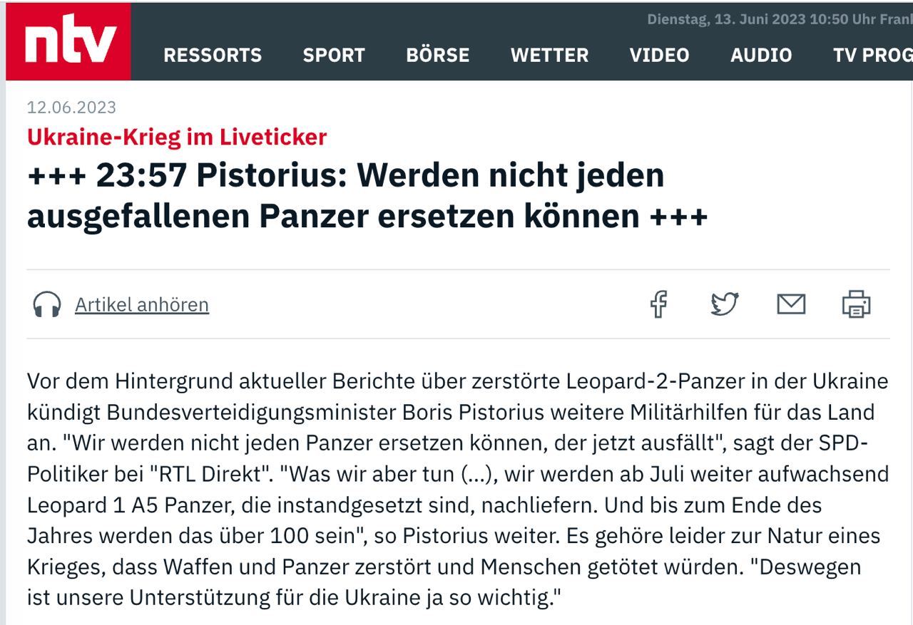11.00 Германия не сможет заменить Украине каждый танк, потерянный в ходе наступления, заявил министр обороны ФРГ Борис Писториус.