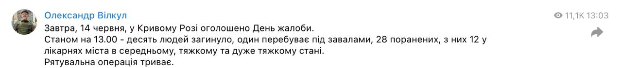 13.22 В Кривом Роге уже десять погибших после ракетного удара, сообщил глава городской администрации Александр Вилкул.
