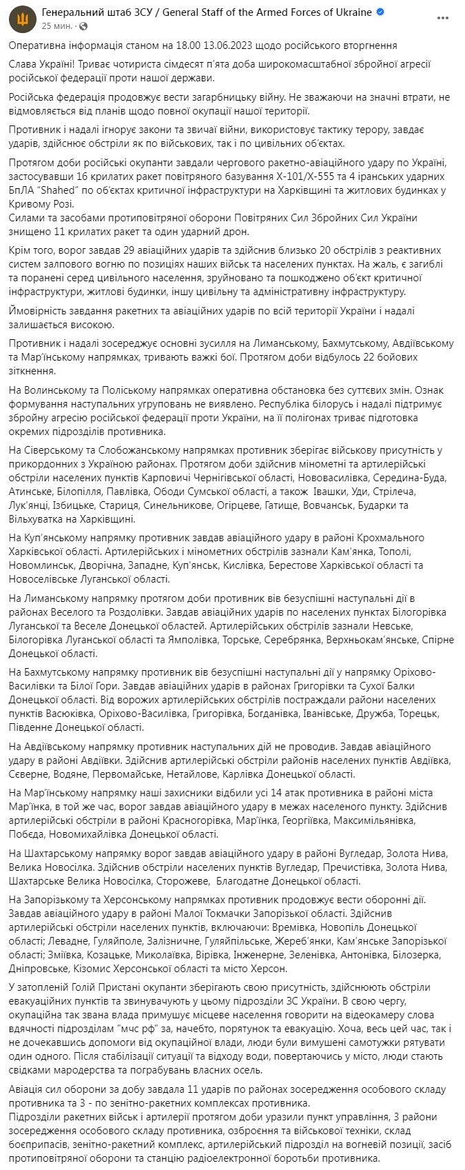 Во вторник 13 июня, в Украине продолжается 475-й день войны с Россией.