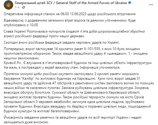 Во вторник, 13 июня, Генштаб ВСУ обнародовал сводку о ситуации на фронте.