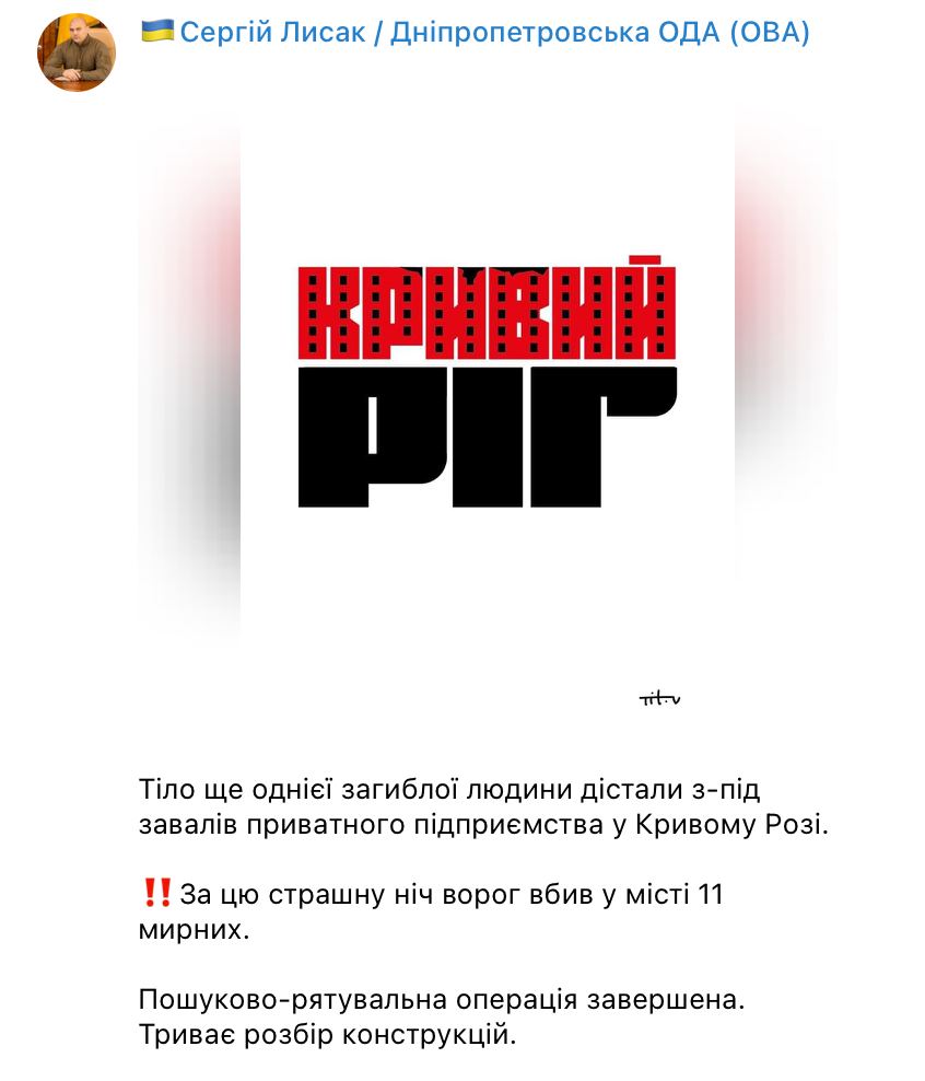 Глава Днепропетровской ОВА Сергей Лысак сообщил, что в городе уже 11 жертв ракетного удара по пятиэтажке, предприятию и другим объектам. Тело еще одного погибшего извлекли из-под завалов частного предприятия. Также в городе 28 раненых, из них 12 в больницах города в среднем, тяжелом и очень тяжелом состоянии.