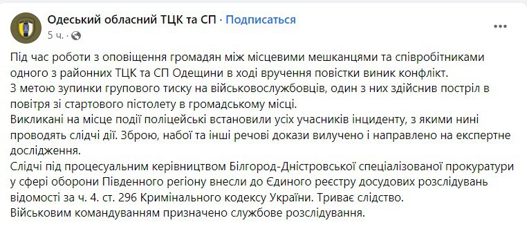 "Во время работы по оповещению граждан между местными жителями и сотрудниками одного из районных ТЦК и СП Одесской области в ходе вручения повестки возник конфликт. В целях остановки группового давления на военнослужащих один из них произвел выстрел в воздух из стартового пистолета в общественном месте", – говорится в посте ТЦК.