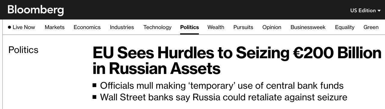 14.25 Евросоюз пришел к выводу, что не может на законных основаниях полностью конфисковать замороженные российские резервы Центробанка на сумму 200 млрд евро, пишет Bloomberg со ссылкой на полученный внутренний доклад.