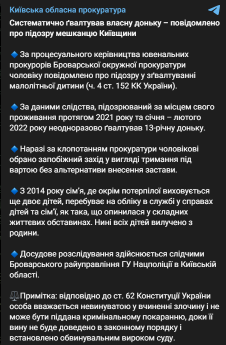"При процессуальном руководстве ювенальных прокуроров Броварской окружной прокуратуры мужчине сообщено о подозрении в изнасиловании малолетнего ребенка (ч. 4 ст. 152 УК Украины). По данным следствия, подозреваемый по месту своего жительства в течение 2021 года и января – февраля 2022 года неоднократно насиловал 13-летнюю дочь", - говорится в сообщении.