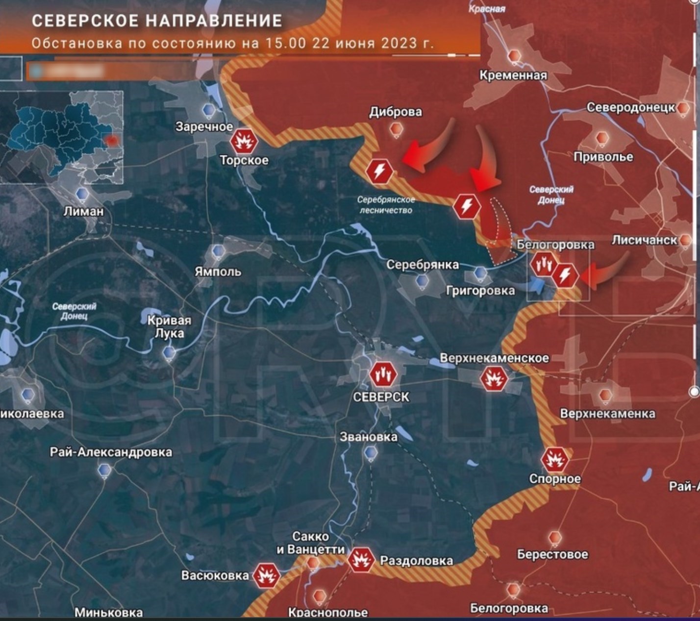 Российские паблики одновременно пишут, что в Серебрянском лесном массиве РФ атакует юго-восточнее Кузьмина.