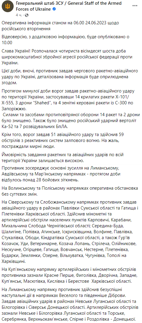 В субботу, 24 июня, Генштаб ВСУ обнародовал сводку о ситуации на фронте.