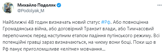 Советник главы Офиса президента Украины Михаил Подоляк заявил, что ближайшие 48 часов определят новый статус РФ. Об этом он написал в своем Twitter.