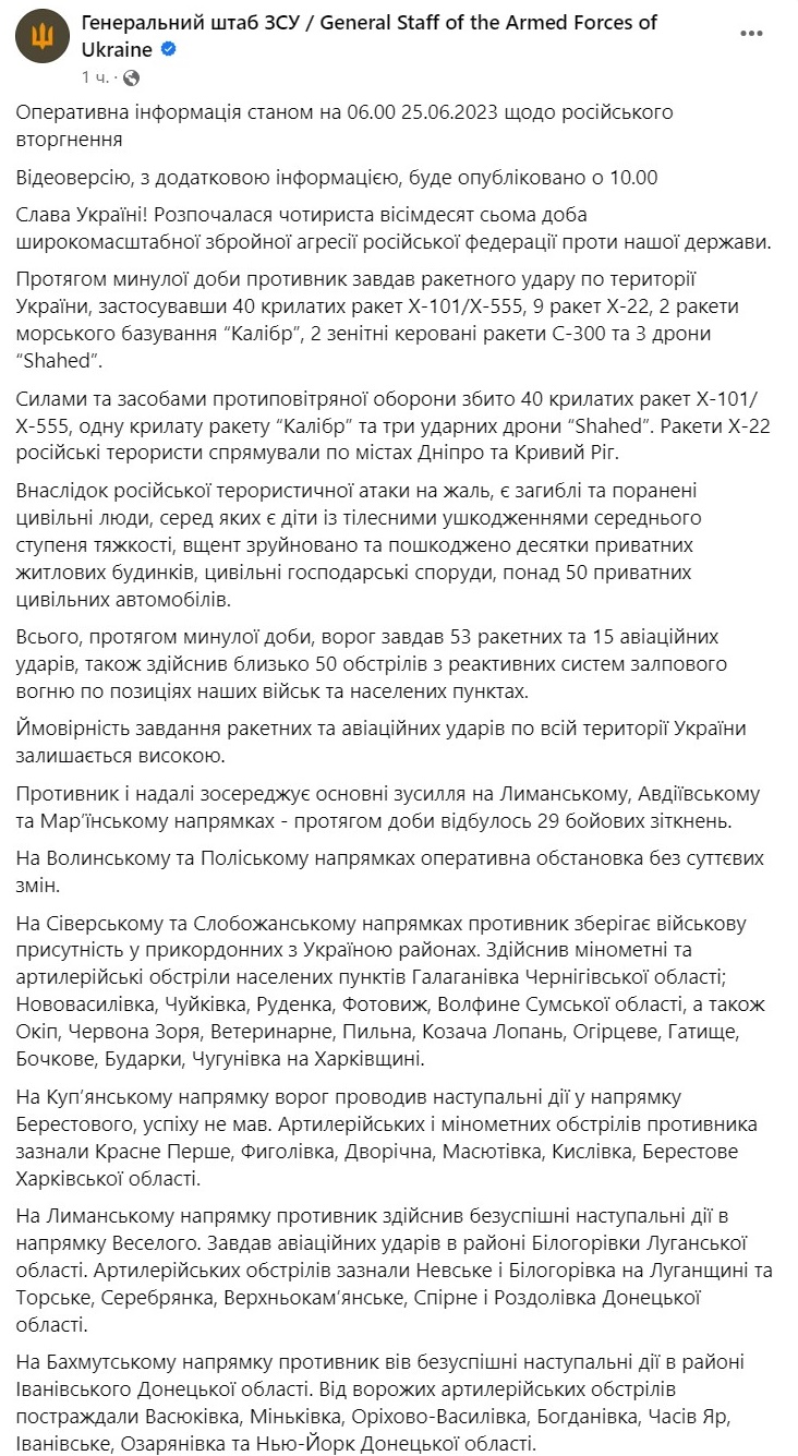 Всего за прошедшие сутки противник нанес 53 ракетных и 15 авиационных ударов, также совершил около 50 обстрелов из реактивных систем залпового огня по позициям Сил обороны и населенным пунктам.
