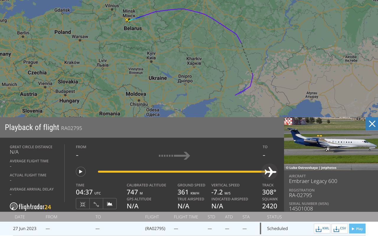 23.57 Бизнес-джет Пригожина вылетел с аэродрома Мачулищи в сторону Москвы. Об этом свидетельствуют данные глобального сервиса Flightradar24.