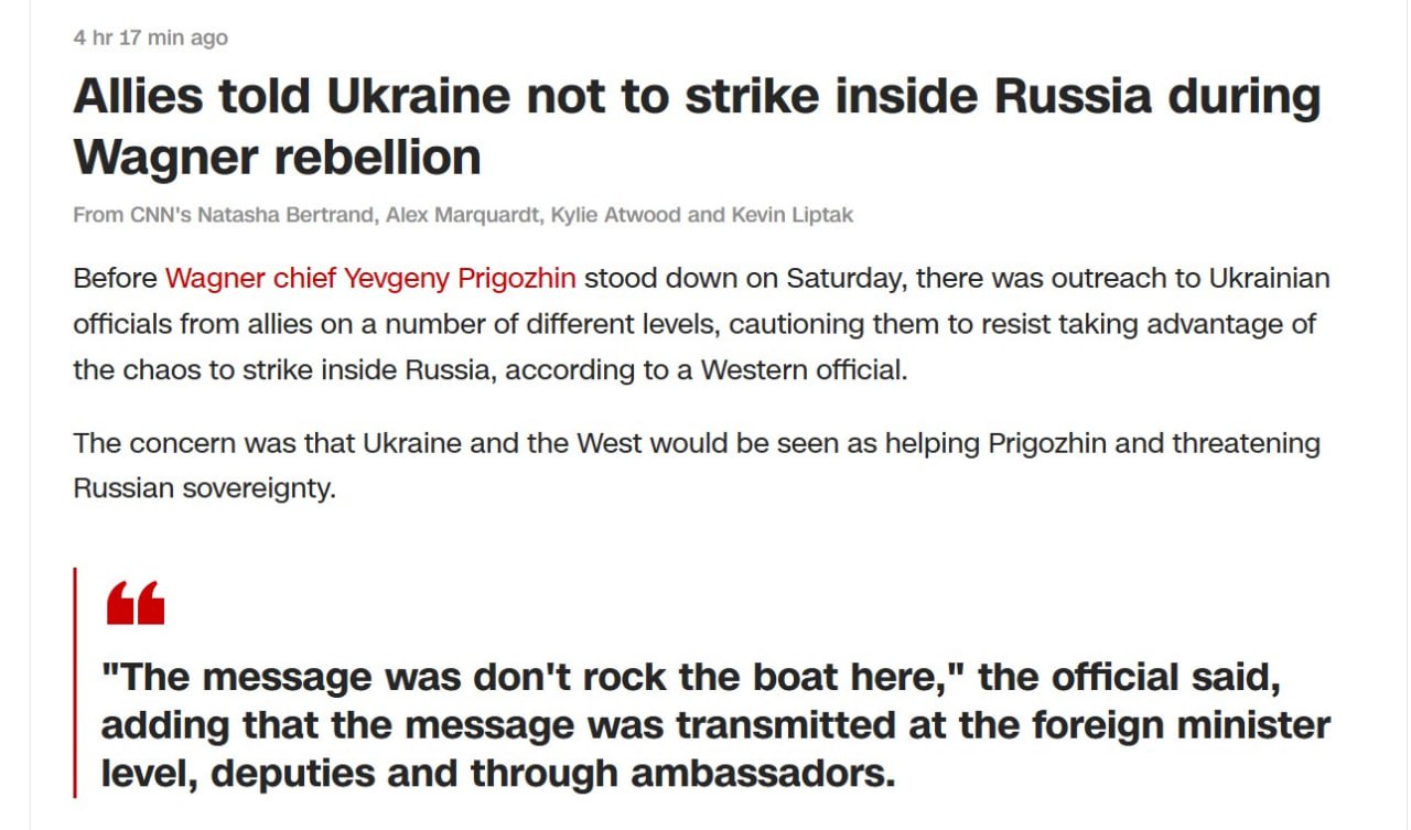 "Опасения заключались в том, что Украина и Запад будут рассматриваться как помогающие Пригожину и угрожающие суверенитету России", - рассказал западный чиновник. По его словам, "мессидж был не раскачивать здесь лодку". Послание было передано на уровне министров иностранных дел, заместителей и через послов.