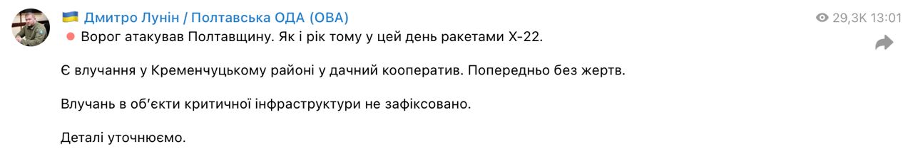 12.00 Ракеты летят в направлении Кременчуга, заявляют Воздушные силы.
