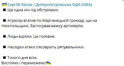 07.32 Ночью РФ ударила из тяжелой артиллерии по Марганецкой громаде в Днепропетровской области. Обошлось без пострадавших.