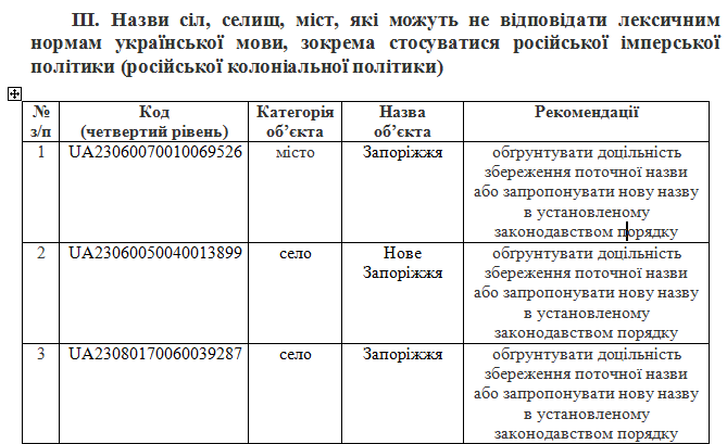 Название областного центра входит в перечень тех, которые "могут не соответствовать лексическим нормам украинского языка, в частности, касаться российской имперской политики". При этом комиссия не пояснила, в чем именно состоит "несоответствие" Запорожья.