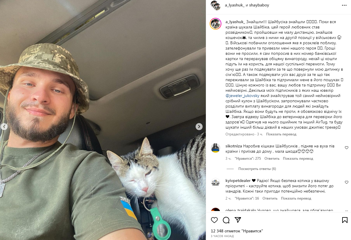 В конце июня мы сообщали, что популярный в соцсетях кот потерялся в Одесской области, а Ляшук обратился к неравнодушным людям за помощью после безуспешных самостоятельных 14-дневных поисков.