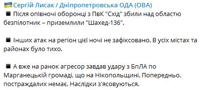 07.32 Ночью над Днепропетровской областью силы ПВО сбили "Шахед".