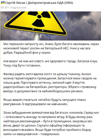 12.31 Несмотря на то, что сегодня ночью взрыва на ЗАЭС не произошло, днепропетровский губернатор призвал запасаться едой и водой.