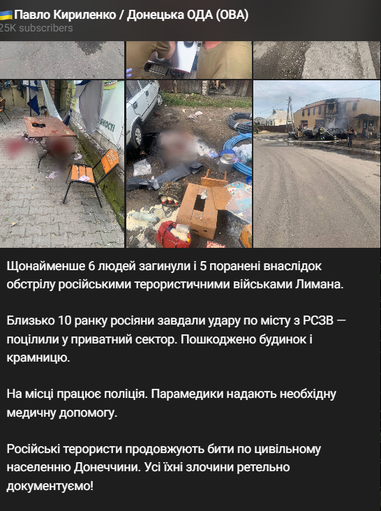 Российские войска нанесли удар по Лиману Донецкой области при помощи РСЗО. В результате обстрела по частному сектору погибли не менее 6 человек, а еще 5 получили ранения.