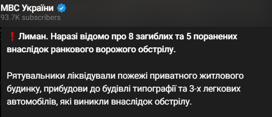 "Сейчас известно о 8 погибших в результате утреннего вражеского обстрела", - говорится в сообщении.