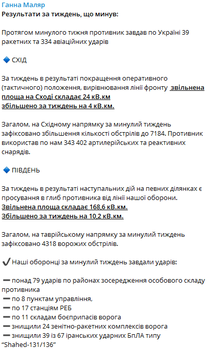 На таврическом направлении за прошедшую неделю было зафиксировано 4 318 вражеских обстрелов. Украинские защитники нанесли более 79 ударов по районам сосредоточения противника, 8 ударов по пунктам управления, 17 ударов по станциям радиоэлектронной борьбы и 11 ударов по складам боеприпасов противника. Также были уничтожены 24 зенитно-ракетных комплекса врага и 39 из 67 иранских ударных беспилотных летательных аппаратов типа "Shahed-131/136".
