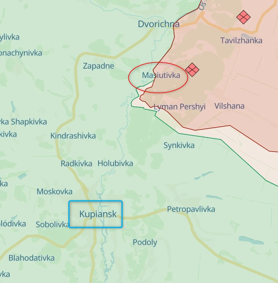 Украинские военные телеграм-каналы пишут, что россияне продвинулись к югу от Масютовки - то есть в сторону Купянска, до которого десять километров. Судят по карте паблика DeepState, россияне движутся по берегу реки Оскол.