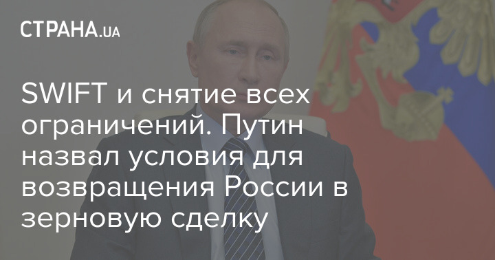Среди условий, которые озвучил Путин, вывод из-под санкций поставок российского зерна и удобрений "на мировые рынки", подключение банков к SWIFT и прекращение "всех ограничений".