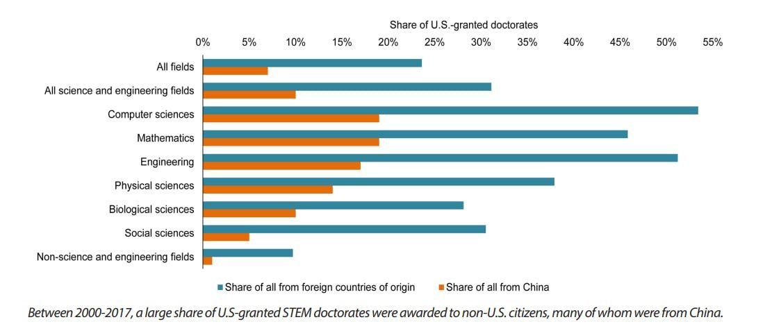 Работники в области науки, технологий, инженерии и математики в США продвигают инновации и экономический рост. Однако инновационная деятельность американских компаний в прошлом была уязвима перед кражами иностранными противниками. Геополитическая напряженность между США и Китаем вызвала споры о государственной политике в отношении приема иностранных студентов и работников в США, особенно китайцев, отмечается в исследовании.