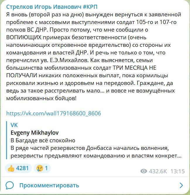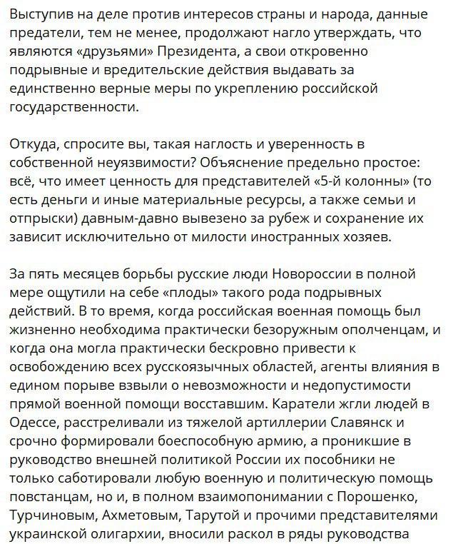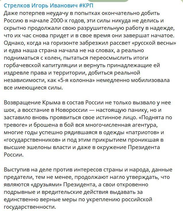 В своих сообщениях Гиркин-Стрелков открыто критикует не только военное руководство РФ, но и всю её систему управления, как внутри страны, так и выстроенную РФ на захваченных украинских территориях. В частности, он обвиняет окружение Путина в сговоре с украинскими олигархами и критикует инициированные Путиным минские соглашения.