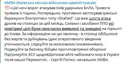Силами и средствами ПВО все воздушные цели были обнаружены и уничтожены на подлете в Киев. По информации на эту минуту - в столице обошлось без жертв и разрушений.