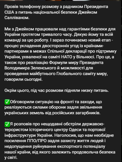 Ермак рассказал Салливану о недавних обстрелах исторического центра Одессы и портовой инфраструктуры Украины.