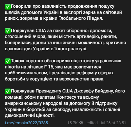 "Также кратко обсудили подготовку украинских пилотов на самолетах F-16, которая должна начаться в ближайшее время, и реализацию реформ в сфере борьбы с коррупцией и верховенства права", – добавил он.