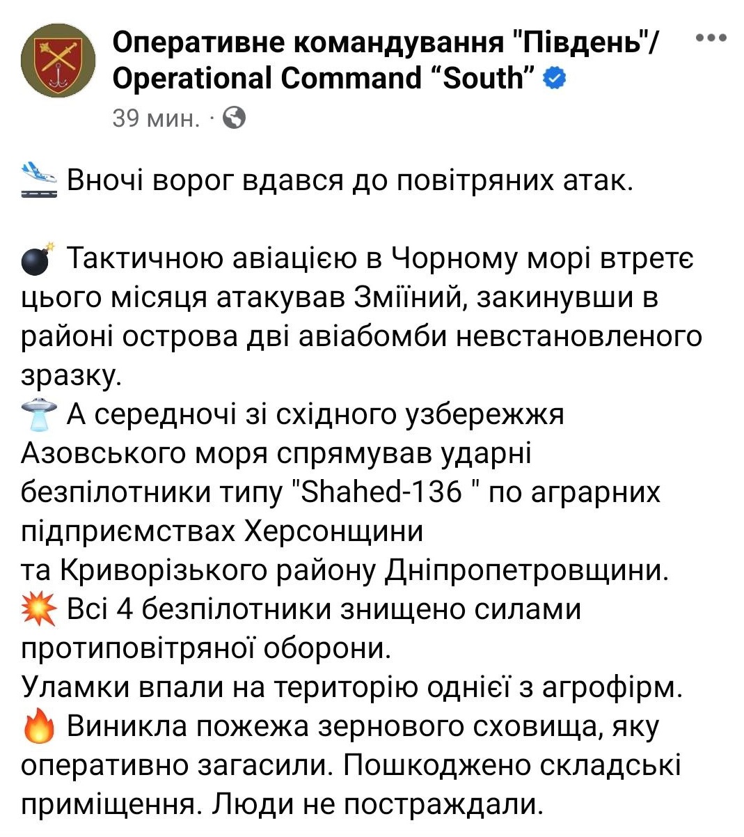 Также ночью с восточного побережья Азовского моря Россия направила ударные беспилотники типа "Shahed-136" по аграрным предприятиям Херсонской и Криворожского района Днепропетровщины.