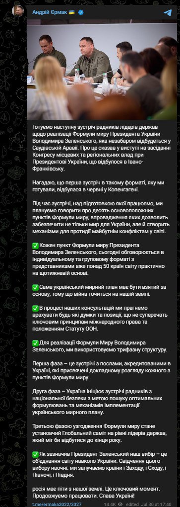 В Саудовской Аравии стороны сосредоточатся на "поиске оптимальных формулировок и механизмов имплементации украинского мирного плана". Эти формулировки могут лечь в основу саммита на уровне лидеров государств, который мог бы состояться до конца года, добавил Ермак.