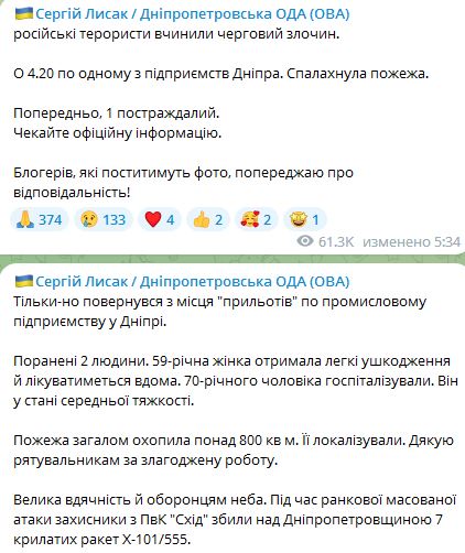 Об этом сообщает глава Днепропетровской ОВА Сергей Лысак.